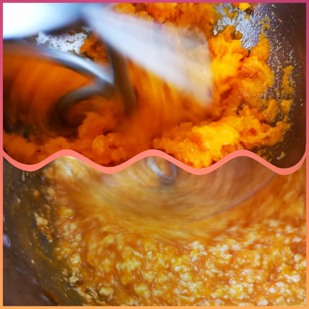 En la primera foto tenéis el momento de la mezcla de la calabaza con el azúcar. En la segunda, el momento de echar la mantequilla