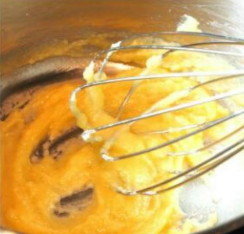 Cuando la cebolla ha blanqueado echaremos la harina, si está tamizada mucho mejor. Removeremos con una espátula de madera o silicona, para que se impregne bien de la mantequilla y la cebolla y pierda el gusto a harina cruda. Removemos durante 3 – 4 minutos y veremos que la harina pierde ese color blanquinoso y se vuelve más amarillo. Veréis que la harina se vuelve densa, además de cambiar de color, eso significa que ya está lista.