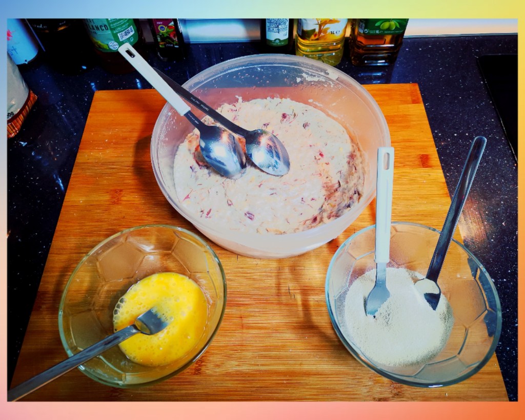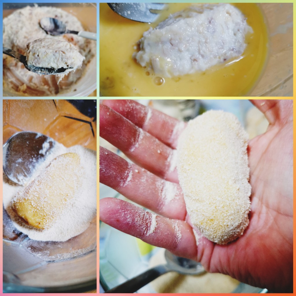En un bol tenemos huevo batido, en otro bol tenemos pan rallado y con la ayuda de dos cucharas para sopa, hacemos la forma de la croqueta. Cuando la tienes, la pasas por huevo y de ahí al pan rallado. Cuando esté cubierta de pan rallado, la coges con la mano, terminas de darle forma y vuelve a pasar por el mismo proceso de empanado: huevo y pan rallado.