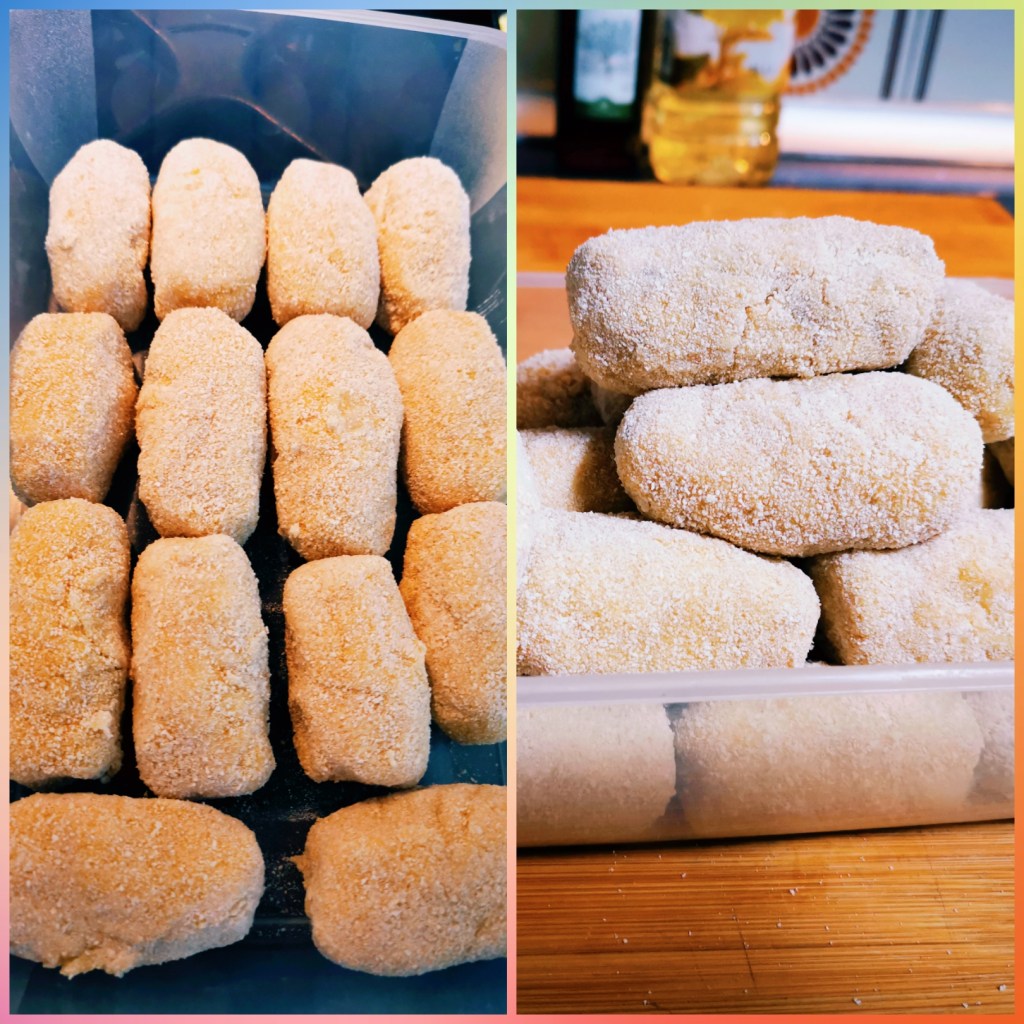 Cuando ha pasado el tiempo necesario, ha llegado el momento de crear nuestras croquetas. Hay personas que utilizan un utensilio que he visto por Amazon, que hace la forma de las croquetas. Otras personas hacen la forma con ayuda de una manga pastelera. En mi casa, se siguen haciendo de la forma antigua: