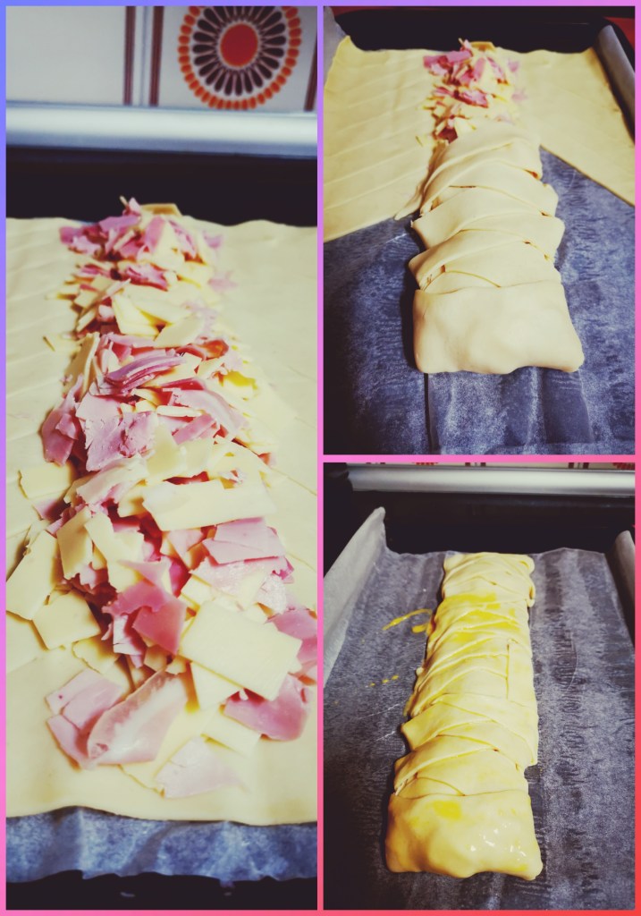 Sobre esta misma base, pondremos nuestros ingredientes, en nuestro caso, la mezcla de jamón dulce y queso. Solo nos queda cerrar la trenza con los trozos cortados. Poco a poco y con cuidado para que no se rompan. las vamos poniendo unas encimas de otras, simulando una trenza.