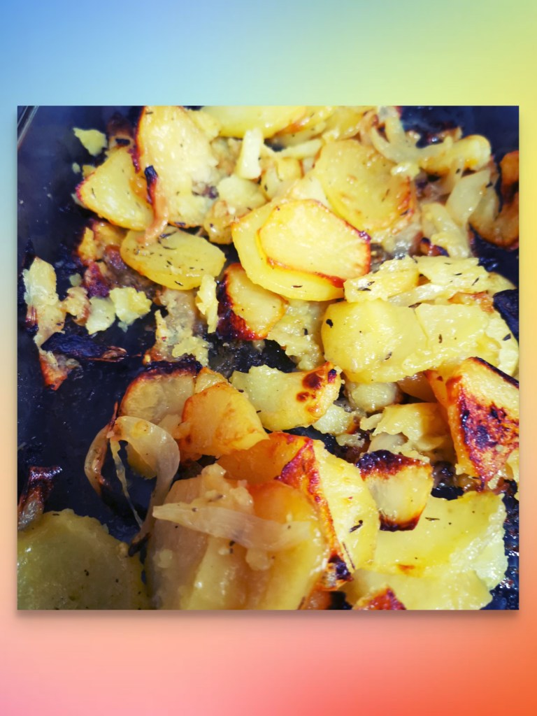 Ponemos un pequeño chorro de aceite en la bandeja y después añadimos las patatas. Intentad que no se amontonen unas encima de otras. Yo normalmente pongo los trozos más pequeños por encima y los grandes debajo, así no se tapan. Echamos la cebolla cortada y añadimos nuestra mezcla por encima, con una cuchara, removemos todo lo que tenemos en la bandeja para que se impregne bien.