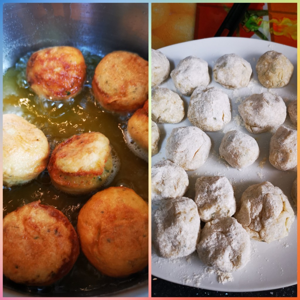 Cuando tengas la forma hecha, debes enharinar y dejar en un plato y así sucesivamente hasta terminar con la masa. A mi, normalmente me salen 18-20 albóndigas. Cuando tengas todas formadas y bien enharinadas (no les saques el exceso de harina porque se te pueden quedar pegadas en el plato y es mejor para poder manejarlas) debes poner una sartén al fuego con abundante aceite.
