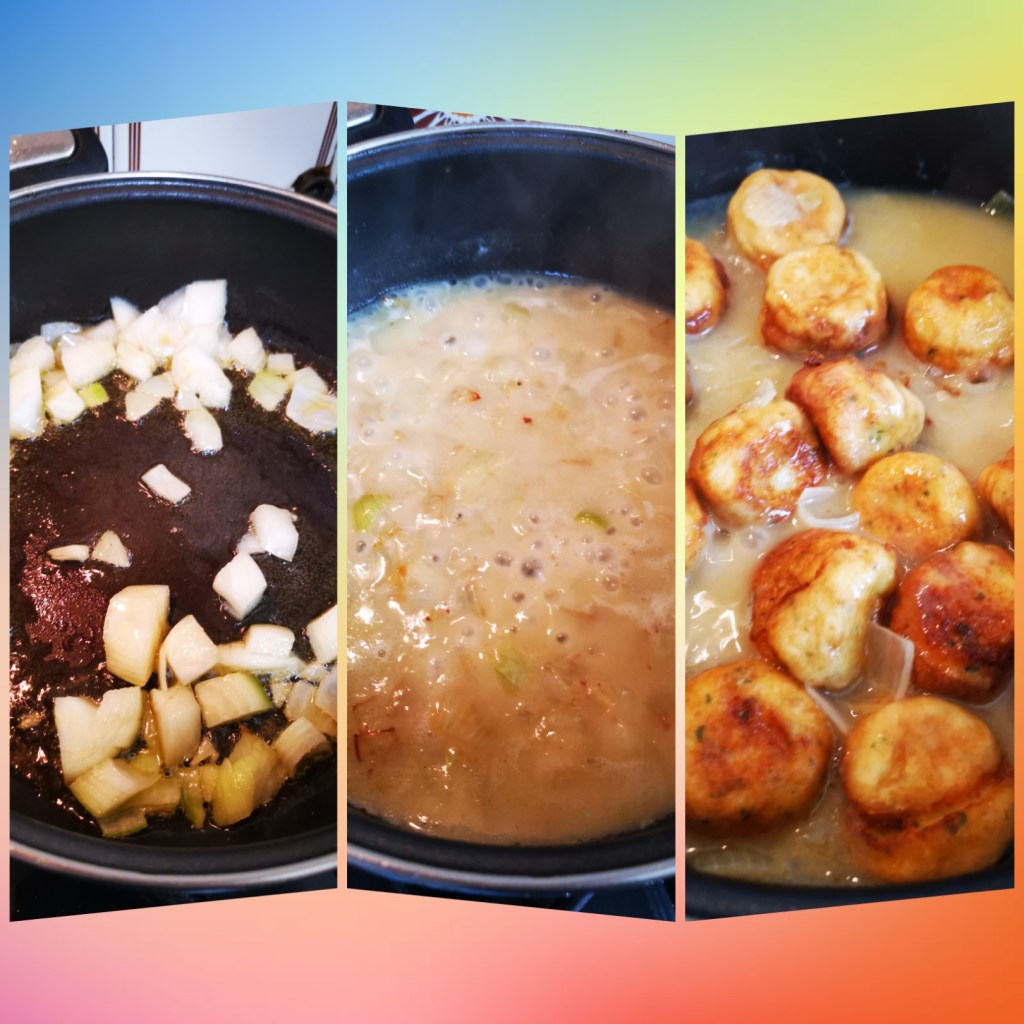 Cuando las albóndigas estén listas, es momento de hacer nuestra salsa. Para ello, pondremos en una cazuela o sartén de paredes altas, un buen chorro de aceite. Cuando empiece a calentar, echaremos el ajo y la cebolla cortada. Bajamos el fuego a intensidad media y vamos removiendo para que no se queme. Cuando empiece a blanquear, debemos echar una cuchara de harina. Removemos y freímos. Cuando la harina adquiere un tono más oscuro, echamos el caldo de pescado (si no tienes caldo de pescado, puedes echar agua).