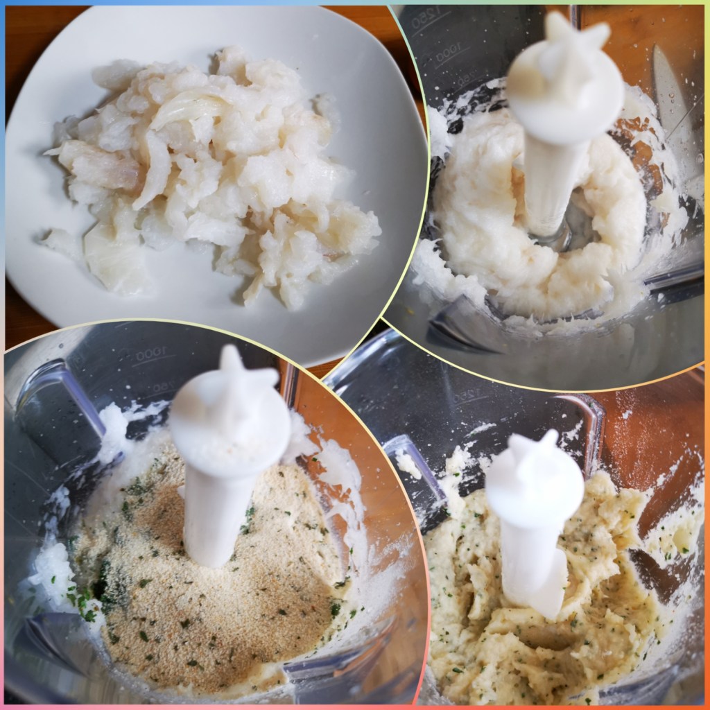 Pondremos en nuestro robot el bacalao, 2 dientes de ajos cortados, un puñado de perejil, 1 huevo y 3 cucharadas de pan rallado y batimos para que se pique y se mezclen todos los ingredientes.
