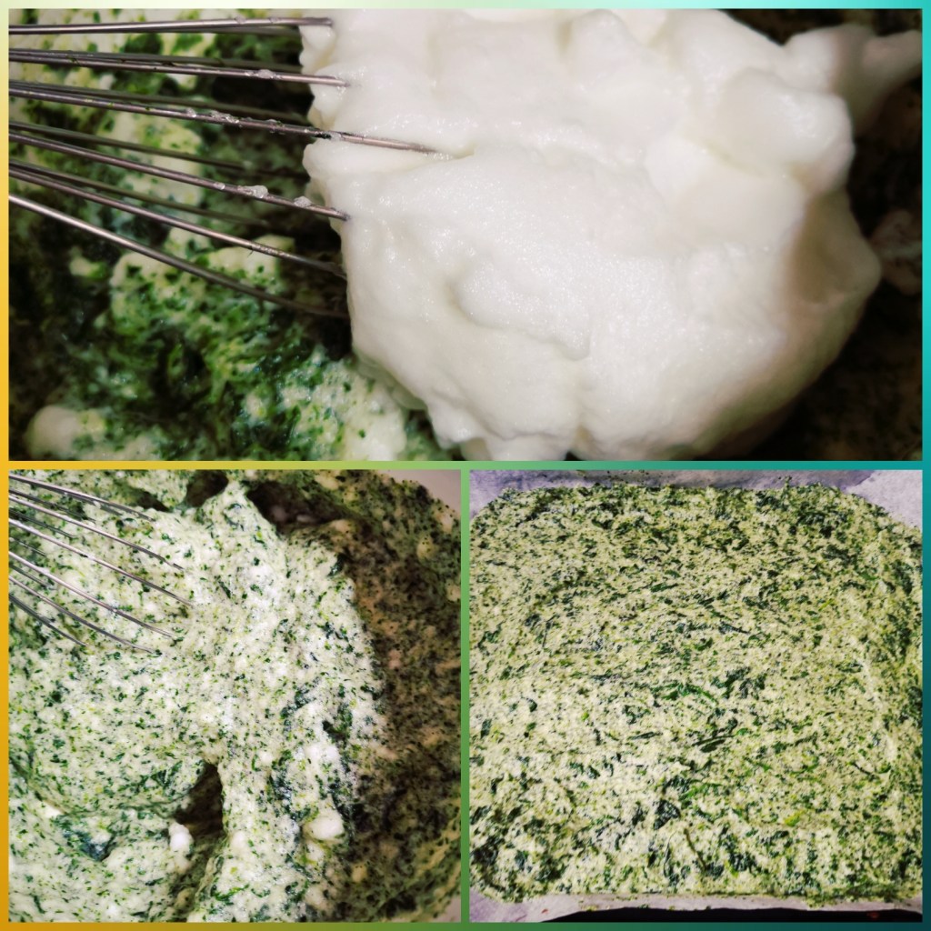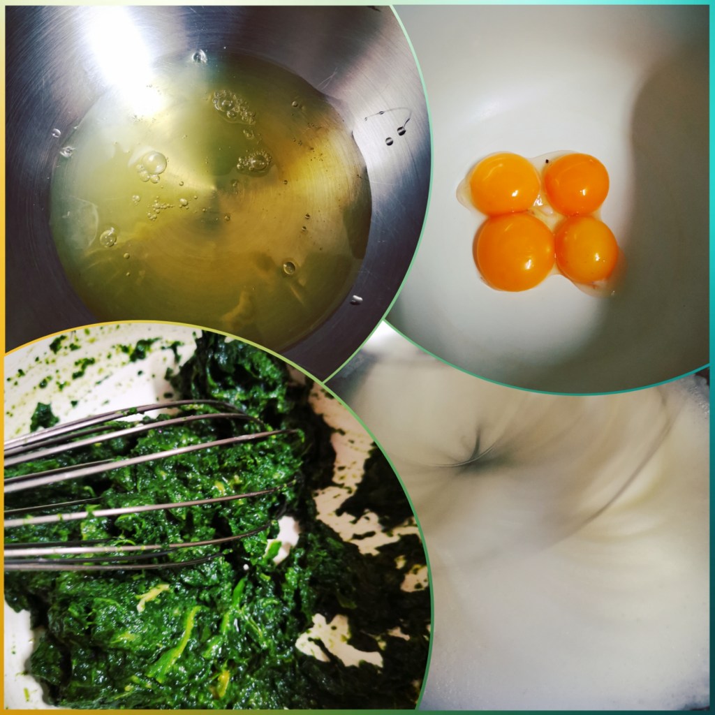 Mientras las claras se están batiendo, en otro bol ponemos el puré de espinacas con las yemas y batimos hasta que se integren.