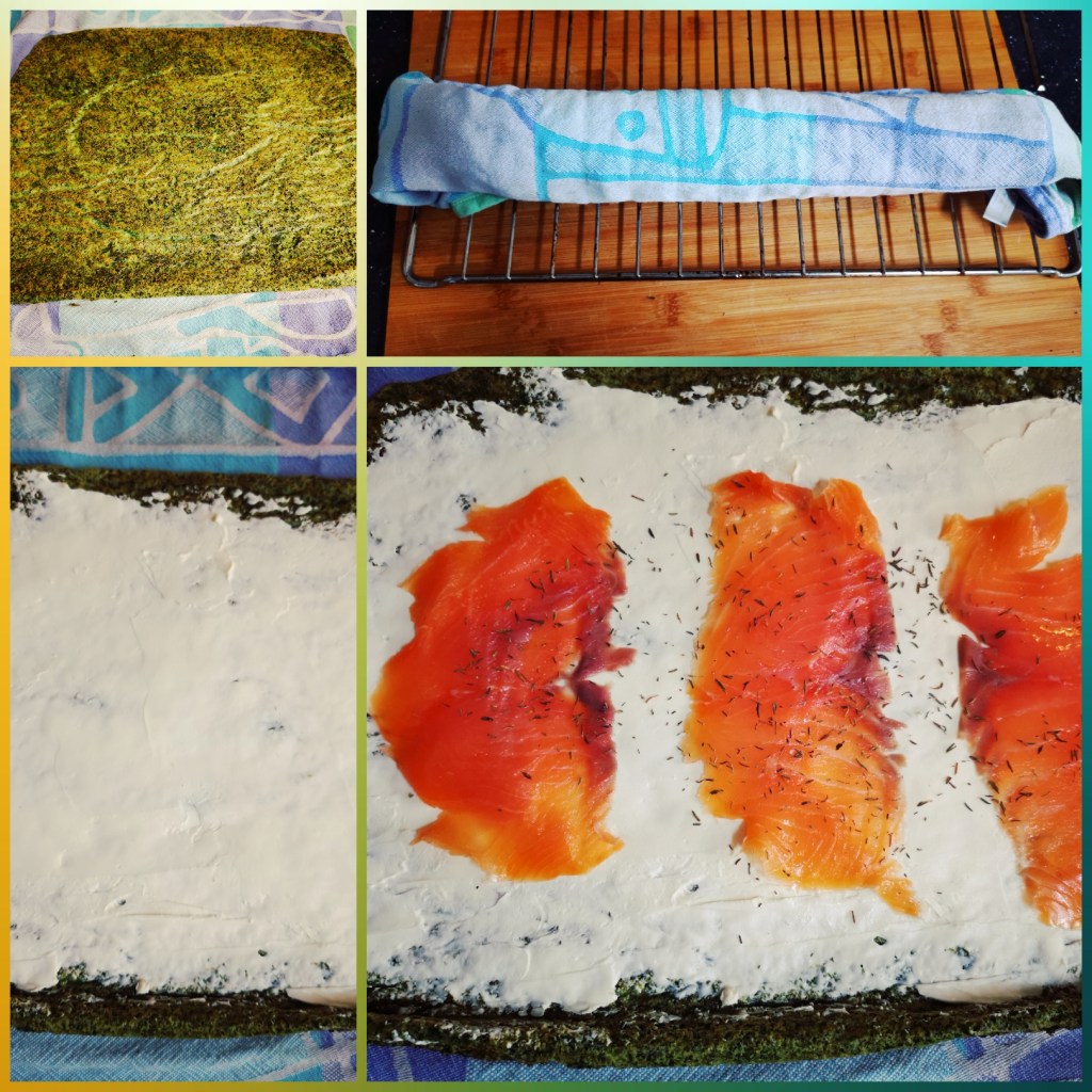 Cuando tenemos el queso crema extendido, solo nos queda colocar el salmón ahumado por toda la zona del queso crema y enrollar nuestra masa de espinacas.