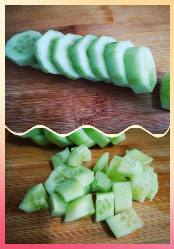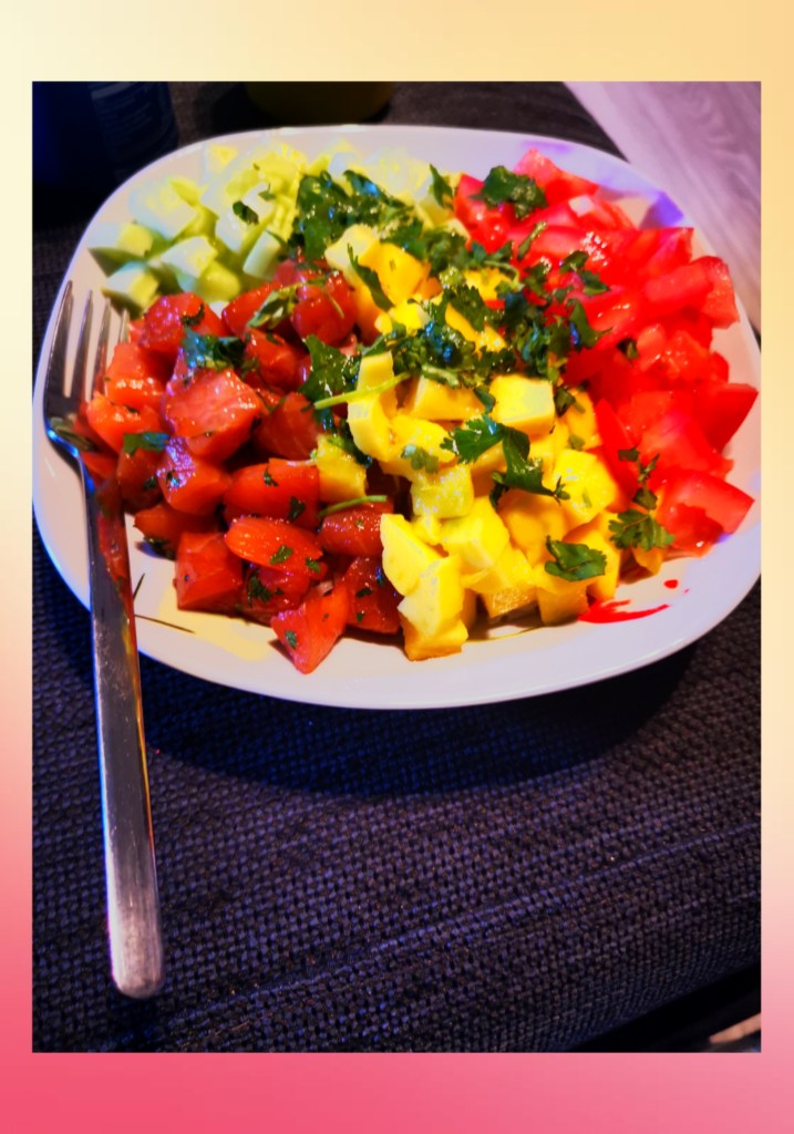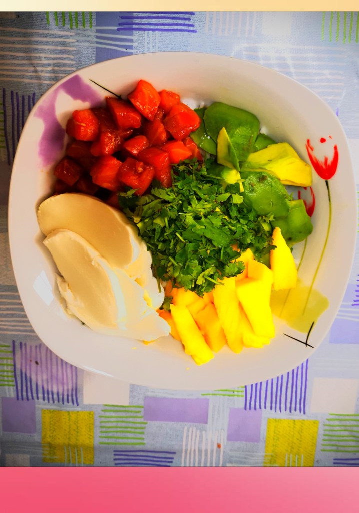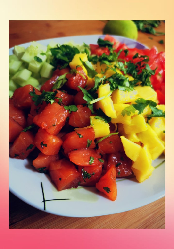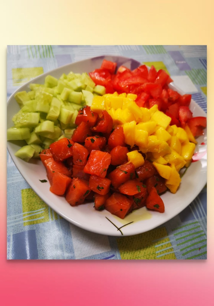 Cuando queramos nuestro plato, lo que debemos hacer es cortar las verduras y la fruta. Puede ser en láminas o cuadrado. Yo, esta vez, he cortado el pepino, el tomate y el mango todo a cuadrados, pequeños-medianos (misma medida que el salmón).