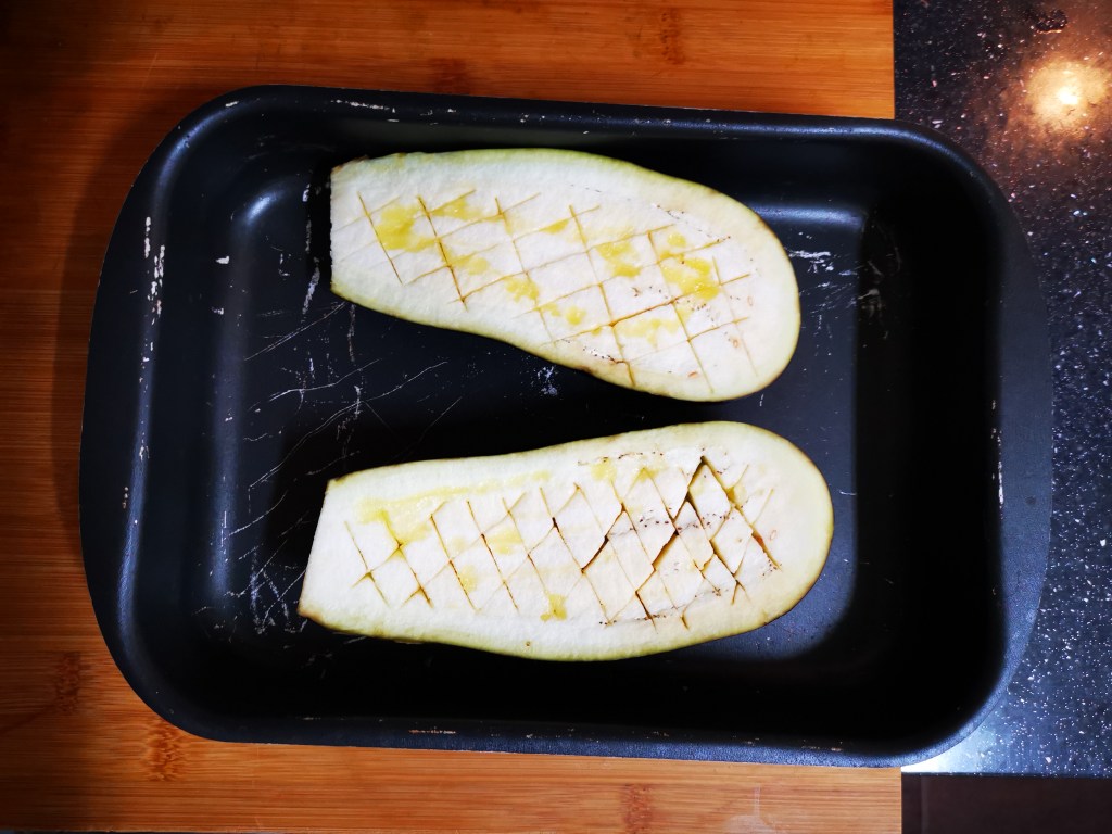 Después cortaremos la berenjena longitudinalmente y le haremos cortes oblicuos, haciendo rombos en su carne. Recordar no llegar hasta el final. Poner un chorrito de aceite y meter en el horno entre 30 – 40 minutos o hasta que veas que la carne empieza a dorarse por encima.