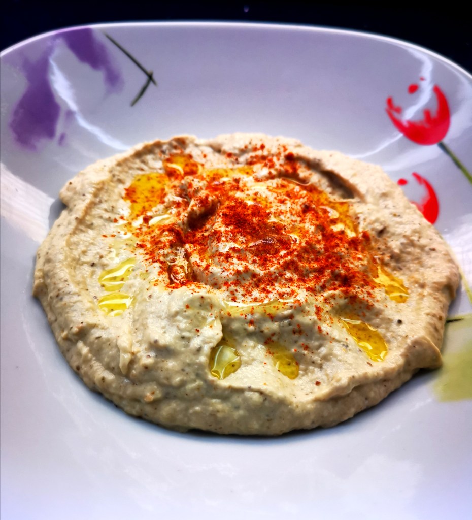 Cuando esté todo mezclado y bien integrado, ya tendrás tu Baba Ganoush. Para la presentación, yo lo puse en un plato hondo, pero lo puedes poner en un bol. Después decoras la superficie. Yo esta vez le puse pimentón dulce y un chorrito de aceite de oliva. Pero le puedes poner cilantro fresco picado (y si no tienes cilantro y sí perejil, también sirve).