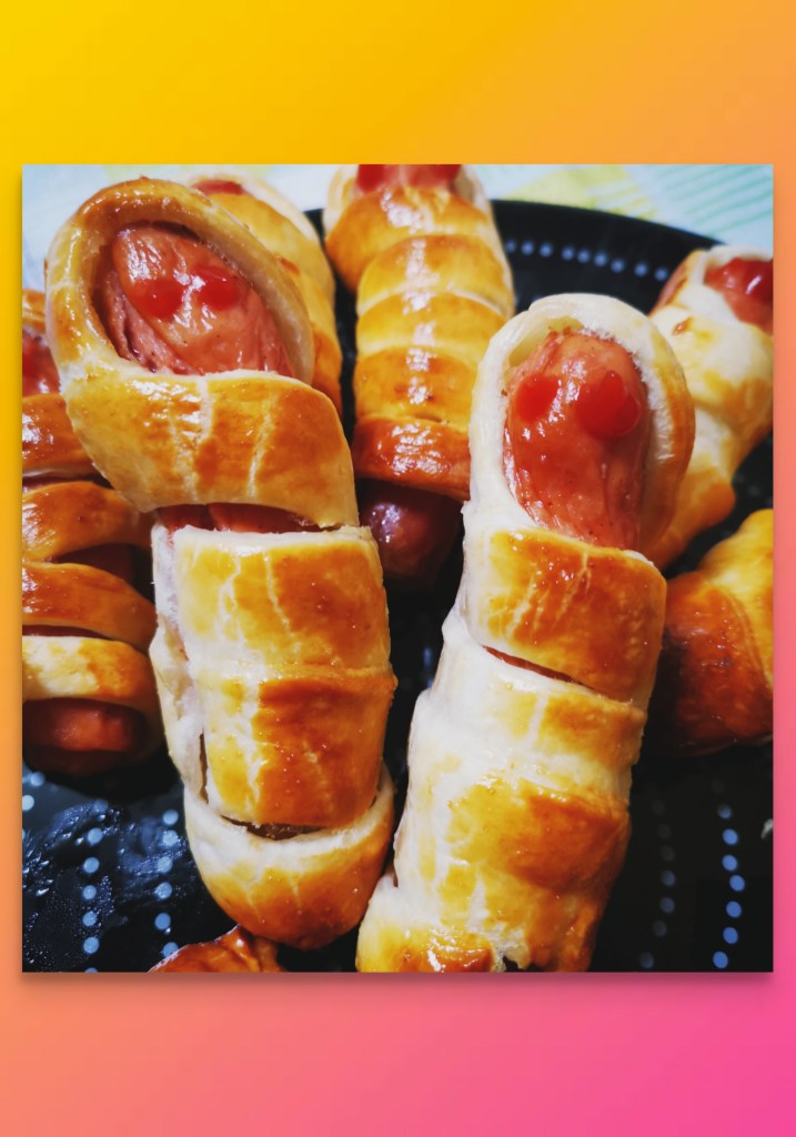 Después de partirlos, empecé a enrollarlos con la masa. Para que no se mueva al meterlos en el horno, en el principio del frankfurt le hice una especie de sombrerito y luego fui enrollando. Además, no lo hice perfecto, para que en algunos se les viera parte del cuerpo y diera más miedo.