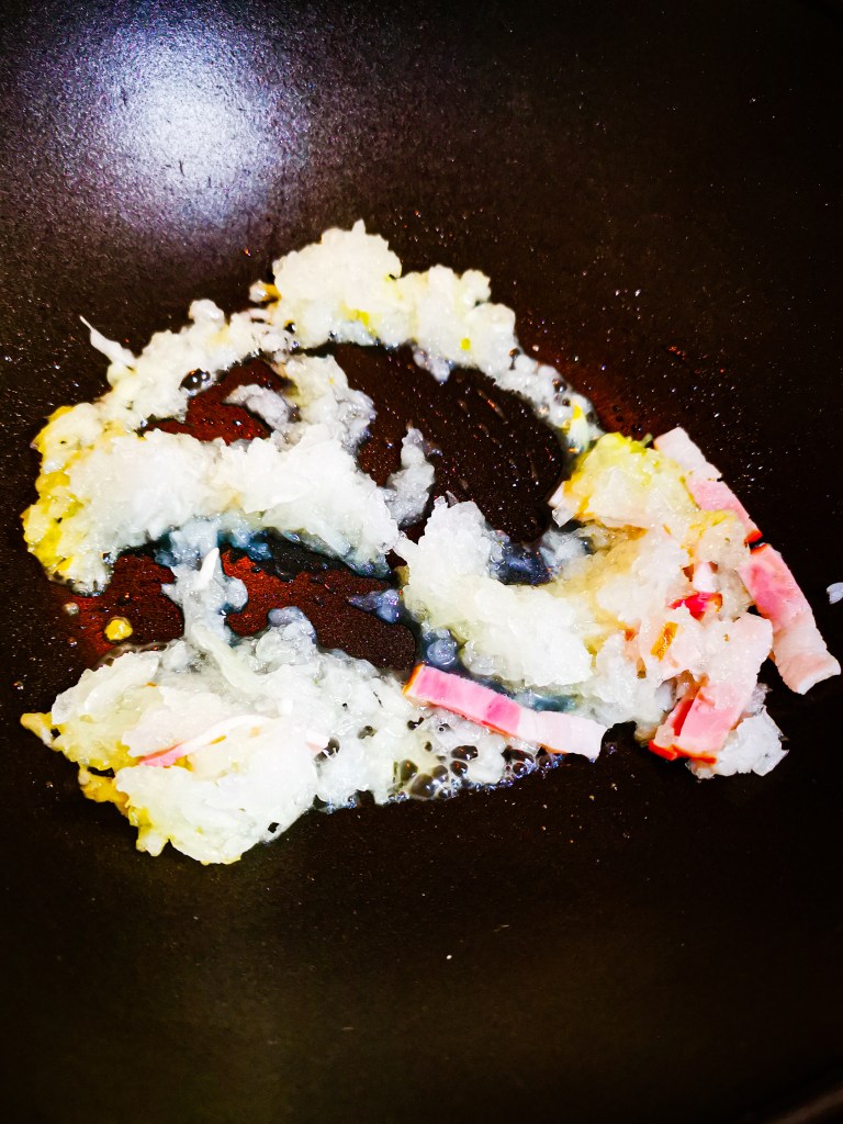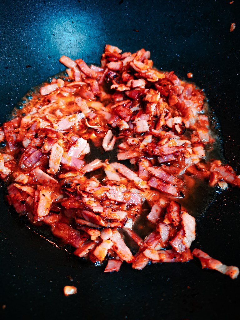Ponemos el wok al fuego con un pequeño chorro de aceite de oliva. Echaremos la cebolla y los trozos de bacon con más grasa.
