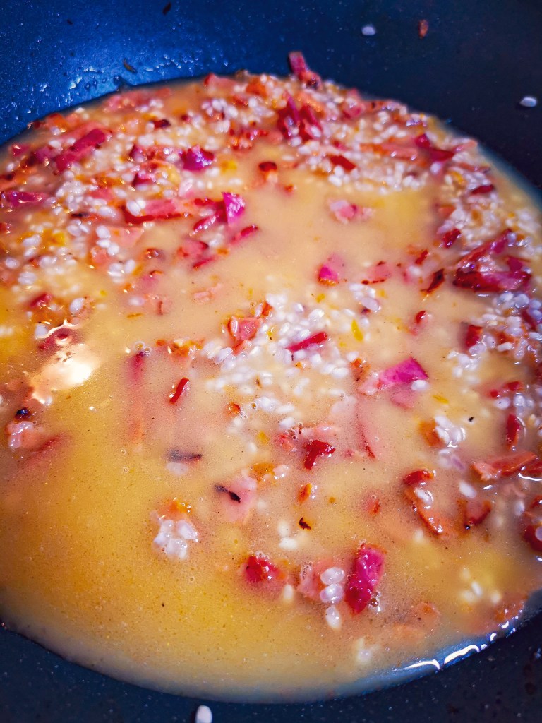 Me gusta cocinar el risotto en mi wok. Al ser una sarten alta con un buen fondo queda genial y es muy cómodo.